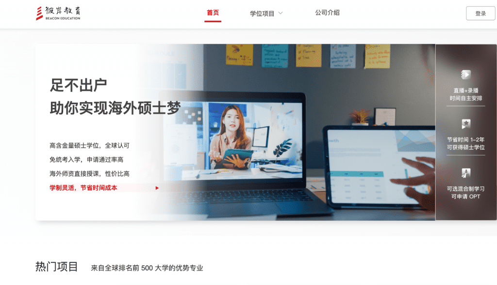 Beacon Education aims to provide localized online master’s degree services for adult students in China in cooperation with global universities. Their partners include Duke, Otago University, Virginia Tech, Illinois Tech, and Tennessee. Currently, the website lists 19 online degrees, including MBAs and STEAM master’s degrees.