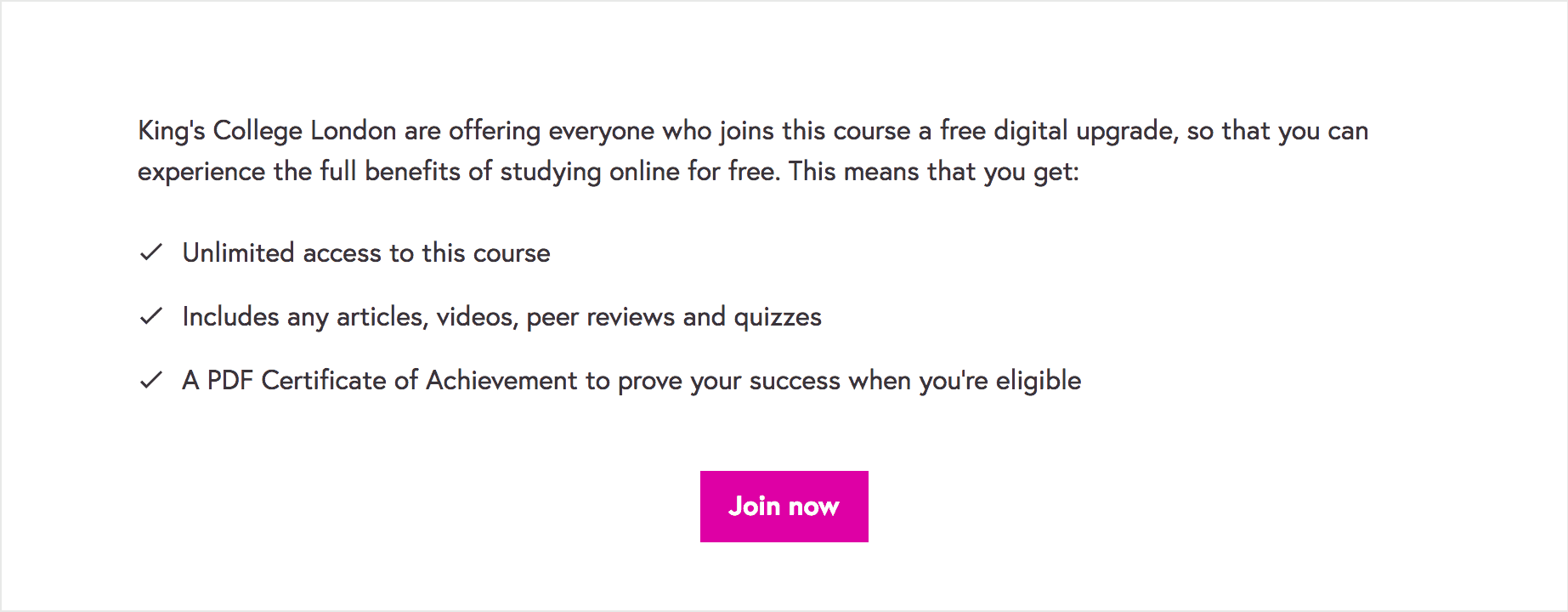 As it turns out, there are even a few courses in which you can still earn a free certificate. While trying to collect pricing data for FutureLearn courses, I discovered 102 courses on the FutureLearn platform that offer a free “digital upgrade”, which includes unlimited access to the course, quizzes, and a digital Certificate of Achievement upon completion. These courses span a wide range of topics, from bacterial genomics to social media.